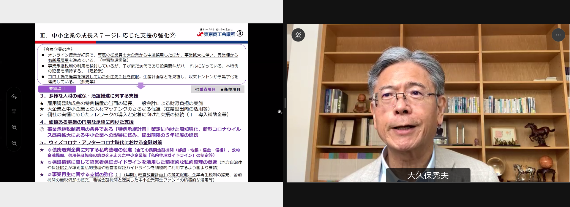 大久保委員長は「ウィズコロナ、アフターコロナに向けた生き残りに向けて中小企業の前向きな取り組みを後押しすべく、デジタル化の加速化に向けた専門人材による伴走支援や、マル経融資の継続による足元の資金繰り支援のほか、今後大きな課題となる事業再生に対する支援強化をお願いしたい」として、要望内容の実現とさらなる中小企業振興を求めました。