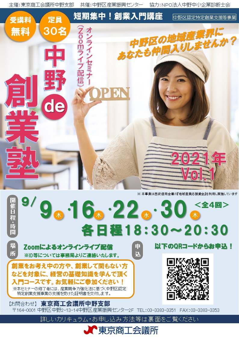 東京商工会議所 中野支部 中野区で創業をめざす方をバックアップする地域密着型の創業支援セミナーを開催いたします。短期間で経営に関する一通りの基礎知識を学べるカリキュラムになっていると同時に、区の創業支援スキーム(融資制度、利子補助、認定特定創業支援事業を受けたことによる優遇措置、等)とも連携していますので、さまざまな施策を有利に活用しながら創業するための方法もご案内します。奮ってご参加ください!