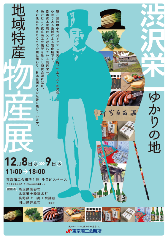 東京商工会議所(三村明夫会頭)は12月8日(水)・9日(木)、東京商工会議所1階多目的スペースにて「~渋沢栄一ゆかりの地~地域特産 物産展」を開催します。