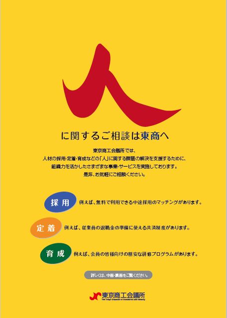東京商工会議所事業推進委員会(委員長=田畑日出男・いであ会長)は9日、東商の実施する人材関連の事業・サービスをまとめたパンフレットを作成しました。近年、会員企業の皆様から、「人」に関する相談が増加していることを受けて作成したもので、東商の実施している人材の採用・定着・育成などの「人」に関するさまざまな事業を網羅的に紹介しています。人に関する課題解決に、東商の事業をご活用ください。
