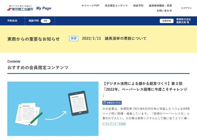 東京商工会議所(三村明夫会頭)はこのたび、当所サービスを利用する事業者へのオンライン窓口として、2022年1月6日(木)より新サービス「東商マイページ」を稼働開始いたします。