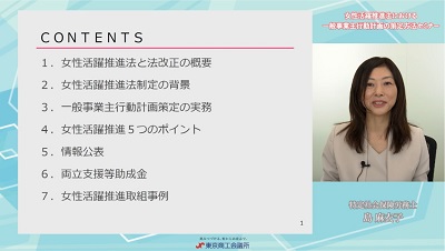 東京商工会議所(産業政策第二部)は、株式会社ヒューマンテック経営研究所 取締役で特定社会保険労務士の島麻衣子氏を講師に迎え、「女性活躍推進法における一般事業主行動計画の策定方法 実務解説セミナー」をオンライン配信形式で開催し、11月30日までの期間内に26人の方が視聴しました。