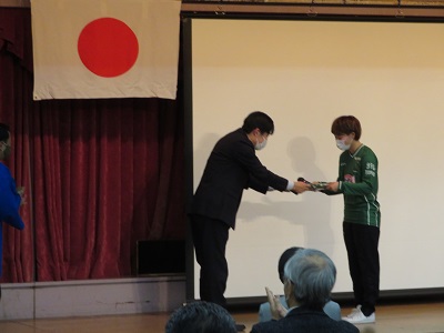 第2部の後半では、東商永年会員紹介や2年ぶりにお年玉抽選会を実施。同抽選会では、昨年の大河ドラマ「青天を衝け」の主人公で、北区飛鳥山に邸宅を構えた渋沢栄一翁にちなんだグッズなどが参加者にプレゼントされました。また、特別賞として北区をホームタウンとする日テレ・東京ヴェルディベレーザの「2021-22シーズンレプリカユニホーム」が土光真代選手から当選者に直接贈呈されました。