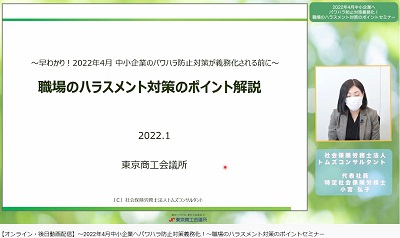 東京商工会議所(産業政策第二部)は、社会保険労務士法人トムズコンサルタント代表社員・特定社会保険労務士の小宮弘子氏を講師に迎え、標記セミナーをオンライン配信形式で開催し、2月14日までの期間内に183人の方が視聴しました。