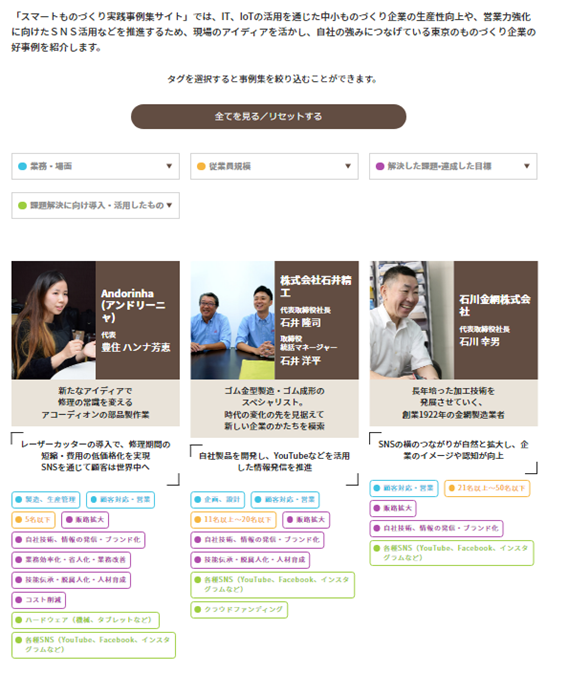 今回は、今まで掲載していた30社に加え、自社製品の開発をSNSなどの活用により積極的に発信した事例や、低迷した業績からインターネット販売で起死回生を図った事例など、コロナ禍で落ち込む受注に対応すべく、営業力強化に取り組んだ10社を新たに追加しました。また、経営者の写真と取組紹介文を一覧で紹介する等、ページのデザイン性・閲覧性を向上させたほか、「業務・場面」、「従業員規模」、「解決した課題・達成した目標」、「解決に向け導入・活用したもの」の4つの検索条件を設定し、事業者の課題に沿った事例を絞り込むことが可能になりました。