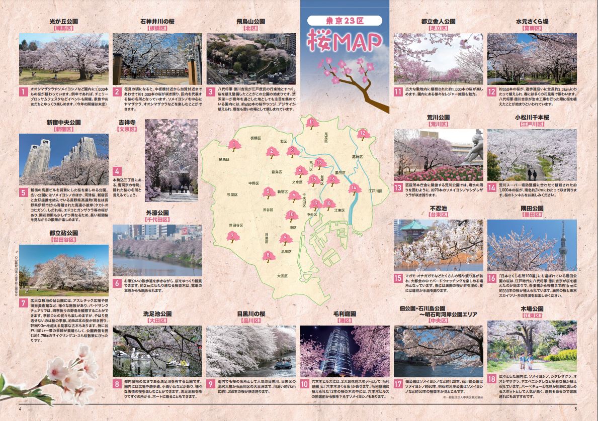 23区の観光協会や区役所などから寄せられた情報をもとに、東京の春を感じられる風景、旬の作物、イベント情報などを掲載。加えて今回は、各区のおすすめ桜スポットについても紹介。