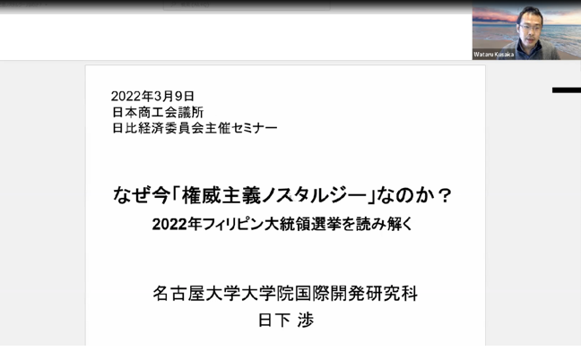 日比経済委員会(筆頭代表世話人=小林健・三菱商事(株)取締役会長)は3月9日、名古屋大学大学院国際開発研究科で准教授を務める日下渉氏を講師に迎え、委員企業ならびにフィリピン日本人商工会議所会員企業を対象に、「なぜ今「権威主義ノスタルジー」なのか?フィリピン大統領選挙から社会変容を読み解く」をテーマとしたオンラインセミナーを開催し、55名が参加した。
