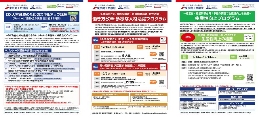 東京商工会議所は、「DX人材育成」「働き方改革・多様な人材活躍」「生産性向上」に着目し、新規研修講座を開催いたします。