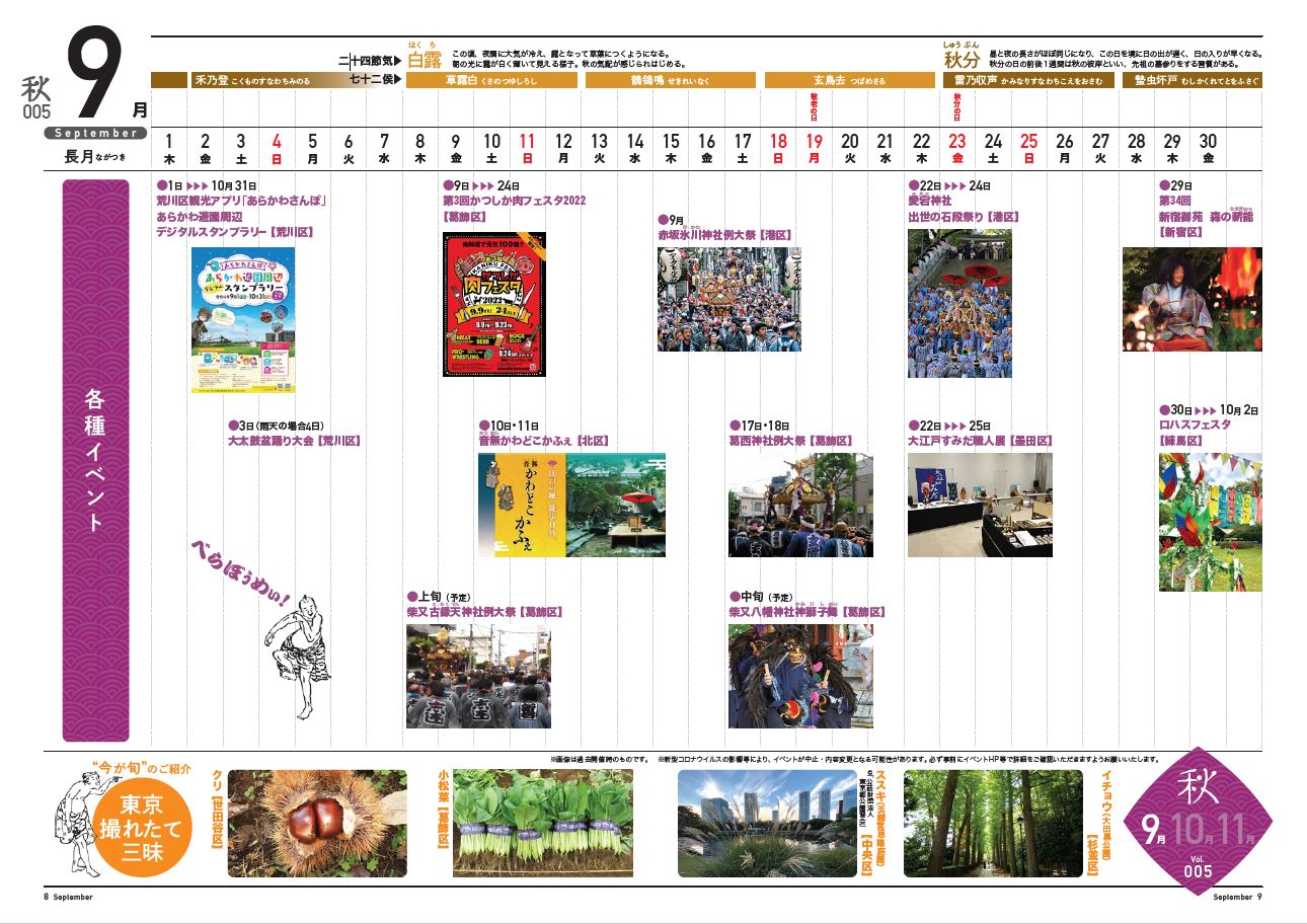 東京23区で9~11月に行われる、地域に密着したイベントや観光情報を掲載。
