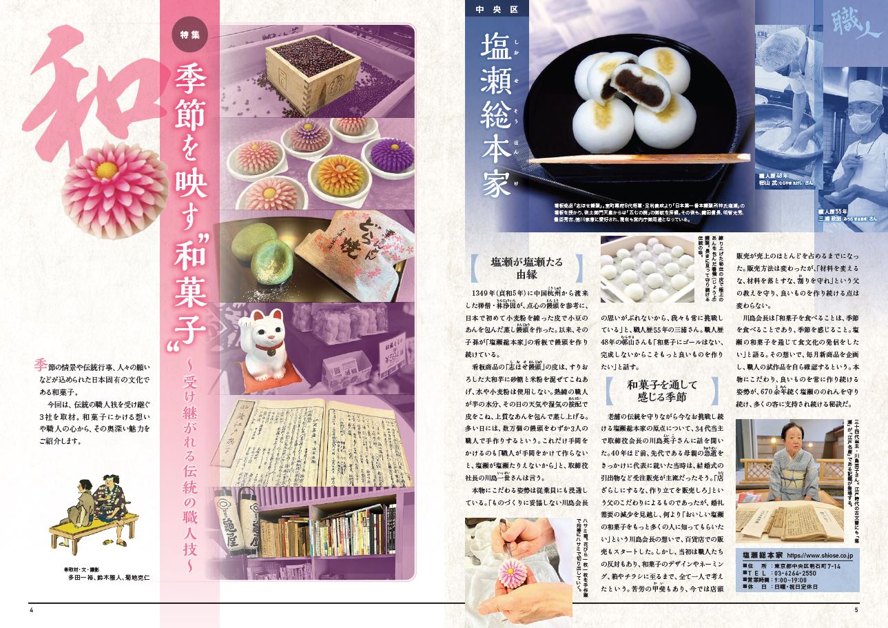 特集記事では、都内の和菓子店の中から、長年にわたって独自の製法を受け継ぐ職人の方々にインタビューを行い、日本の伝統的な食文化にも焦点を当てた内容となっています。