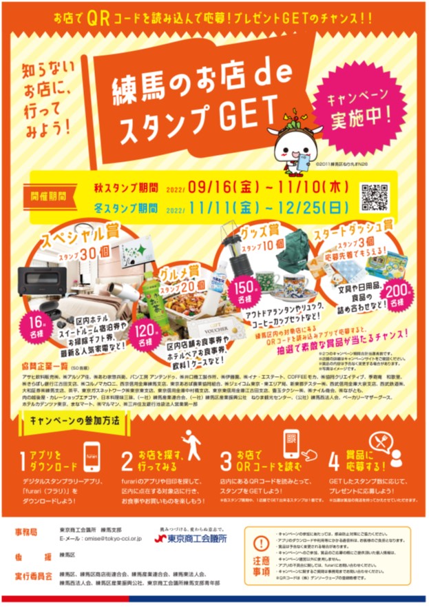 東京商工会議所練馬支部(会長:髙内恒行・豊玉タクシー(株))では、区内消費の活性化を目的に、飲食店・小売店をスポットにしたデジタルスタンプラリー事業「練馬のお店deスタンプGETキャンペーン」を実施します。キャンペーンは、2つの期間(秋スタンプ期間:9月16日(金)から11月10日(木)、冬スタンプ期間:11月11日(金)から12月25日(日))開催し、参加者は集めたスタンプ数に応じて豪華賞品に応募できます。