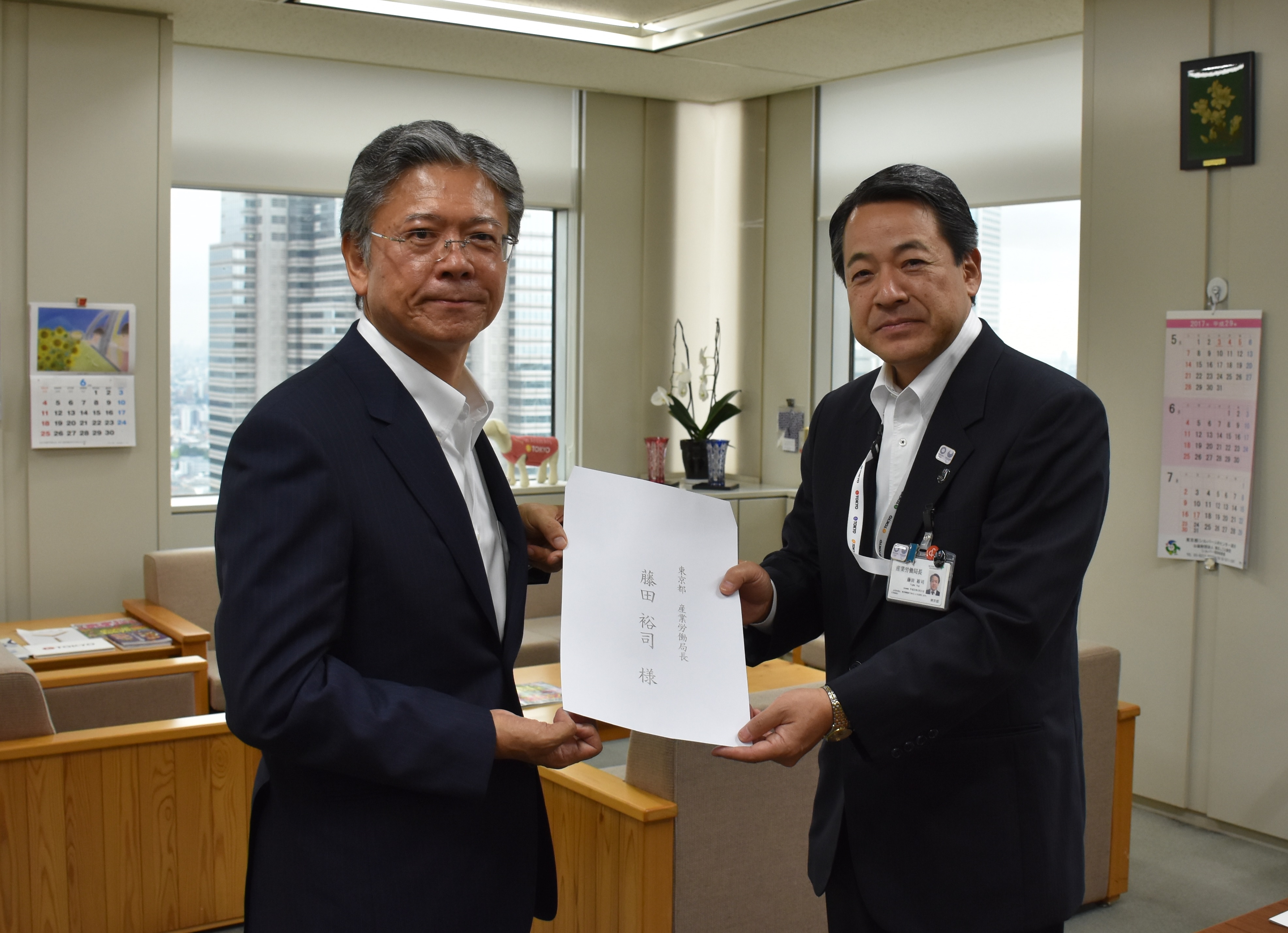 大久保副会頭・中小企業委員長は6月13日に東京都 産業労働局長 藤田 裕司氏を訪問し、6月9日の第696回常議員会にて決議した「東京都の中小企業対策に関する重点要望」を直接提出しました。