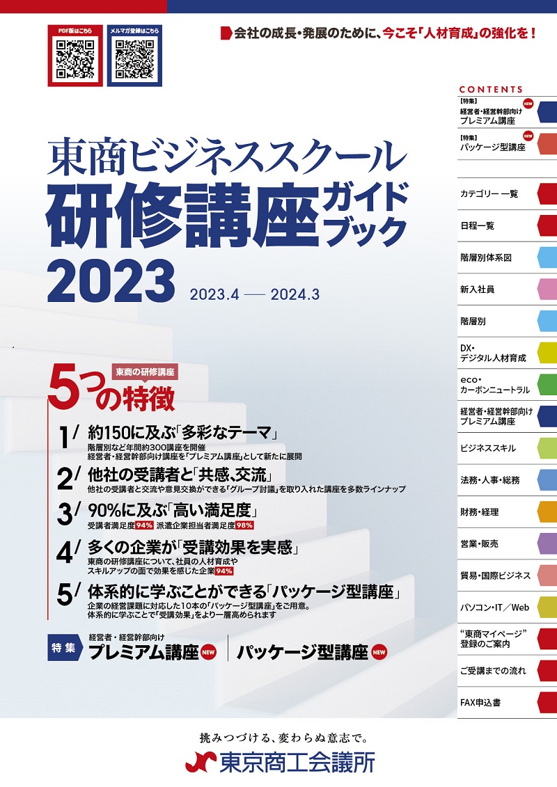 東京商工会議所(小林健会頭)は、この度、2023年度に開催する研修講座の情報を取りまとめた「研修講座ガイドブック」を発行いたしましたので、お知らせいたします。