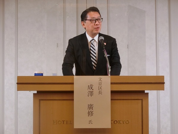 会議に続いて、「文京区の2023年度施策について」と題して、成澤廣修・文京区長から、次年度予算や文京区の重点施策などについてお話いただきました。