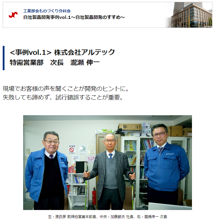 今回は、新たに自社の名刺代わりとなる独自の製品開発に挑戦する中小ものづくり企業を支援することを目的に、当サイト内で『自社製品開発のすすめ』を公開しました。当所が今年度実施した「東商ものづくりゼミナール」に参加した企業のうち2社の事例を紹介しています。