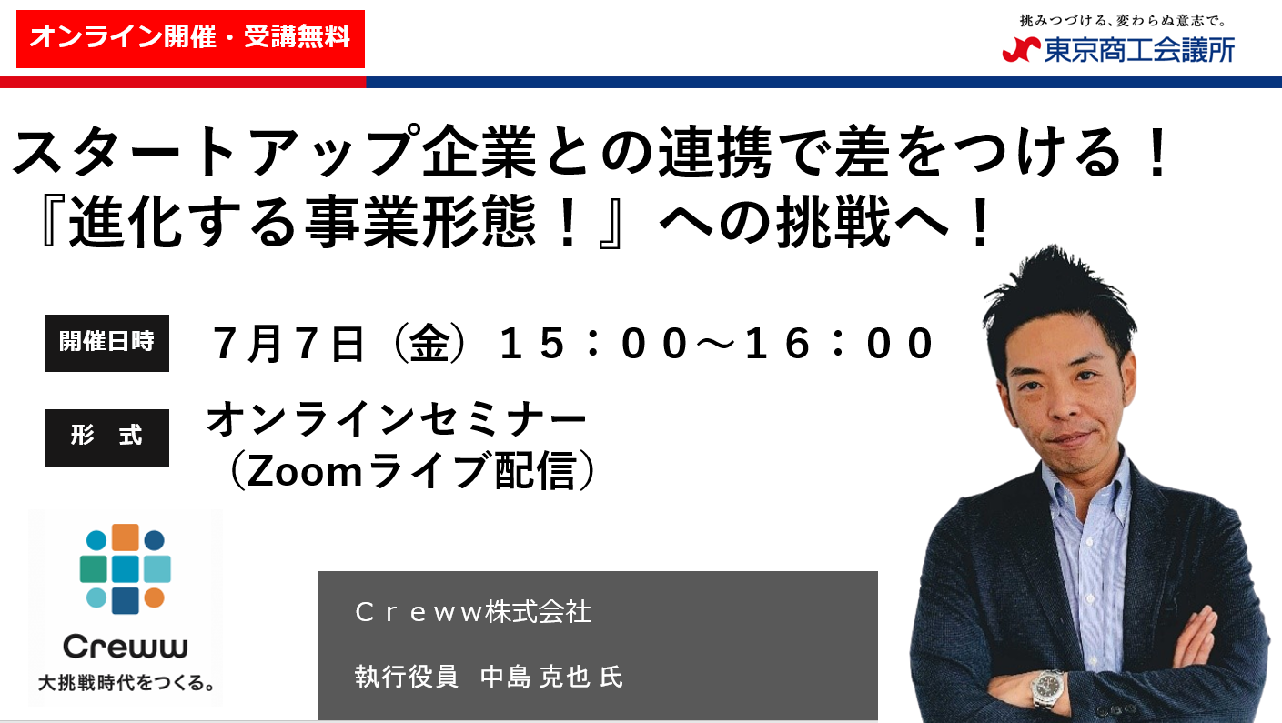 <東商 × Creww連携セミナー>「『スタートアップ企業との連携』で差をつける!『進化する事業形態!』への挑戦へ!」を7月7日(金)に開催します