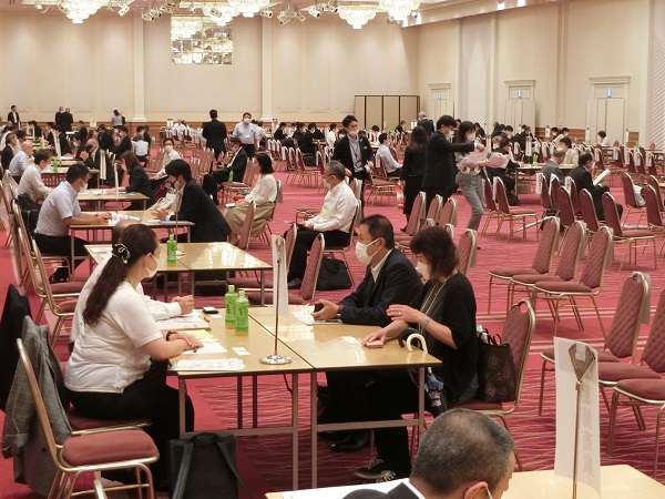来春、高校新卒者の採用を予定している会員企業145社から197名の採用担当者と、城東地区・千葉県・埼玉県の高校から24校・50名の就職担当教職員が参加し、各企業の業務内容や高校生の就職動向などについて情報交換しました。本情報交換会は今年で16回目の開催となります。コロナ下での開催だった昨年から企業数、一社あたりの参加者数も増やし、念願のアクリルパネルなしでの実施となりました。