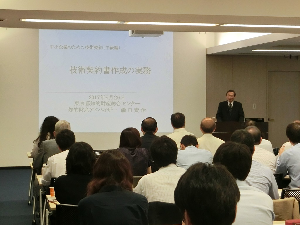 知的財産戦略委員会(委員長:荒井寿光・東京中小企業投資育成株式会社相談役)は、6月26日、東京都知的財産総合センター 知的財産アドバイザーの瀧口賢治氏を招き、「中小企業のための技術契約(中級編)」を開催。約90人が参加した。