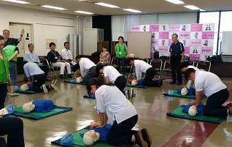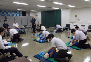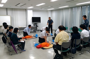 参加者は、万一の時に人命救助が行えるよう、AED(自動体外式除細動器)の実技も盛り込んだ講習を熱心に受講していました。修了者には後日、救命技能認定証が発行されます。