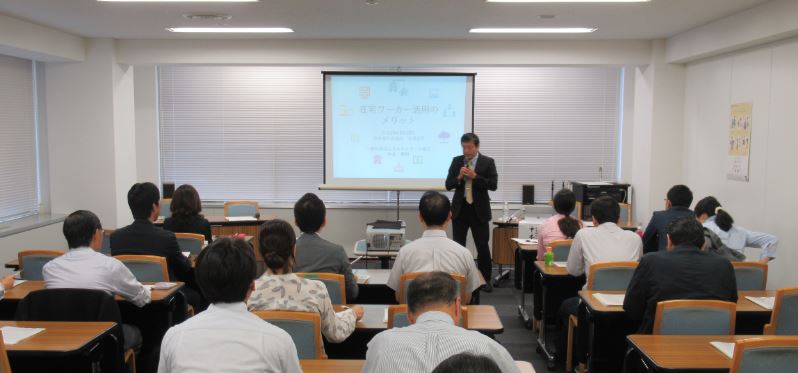 当日は17名が参加。セミナーでは、生産性向上や人材確保、スキル不足解消、コスト削減など、在宅ワーカーの活用による具体的なメリットを解説。また、在宅ワーカーの活用に向けて「在宅ワークの適正な実施のためのガイドライン(厚生労働省)」について分かりやすく説明が行われました。