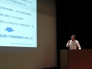 練馬東税務署、練馬西税務署からは消費税の軽減税率制度について、大庭聖司氏(中小企業診断士)からは軽減税率対策補助金等の支援施策についてご説明いただきました。