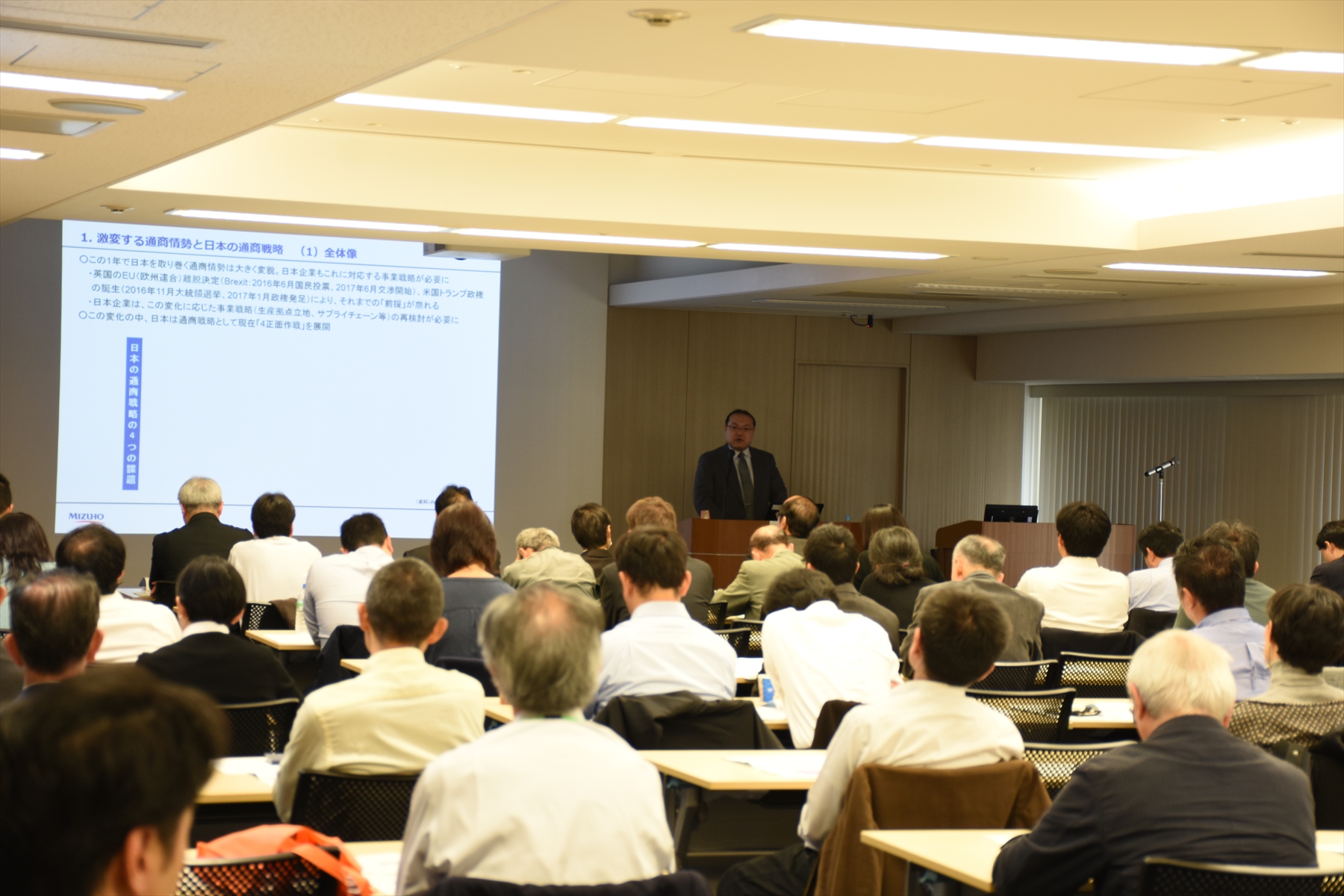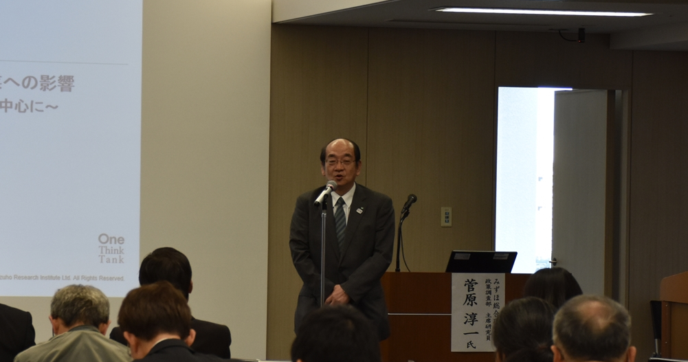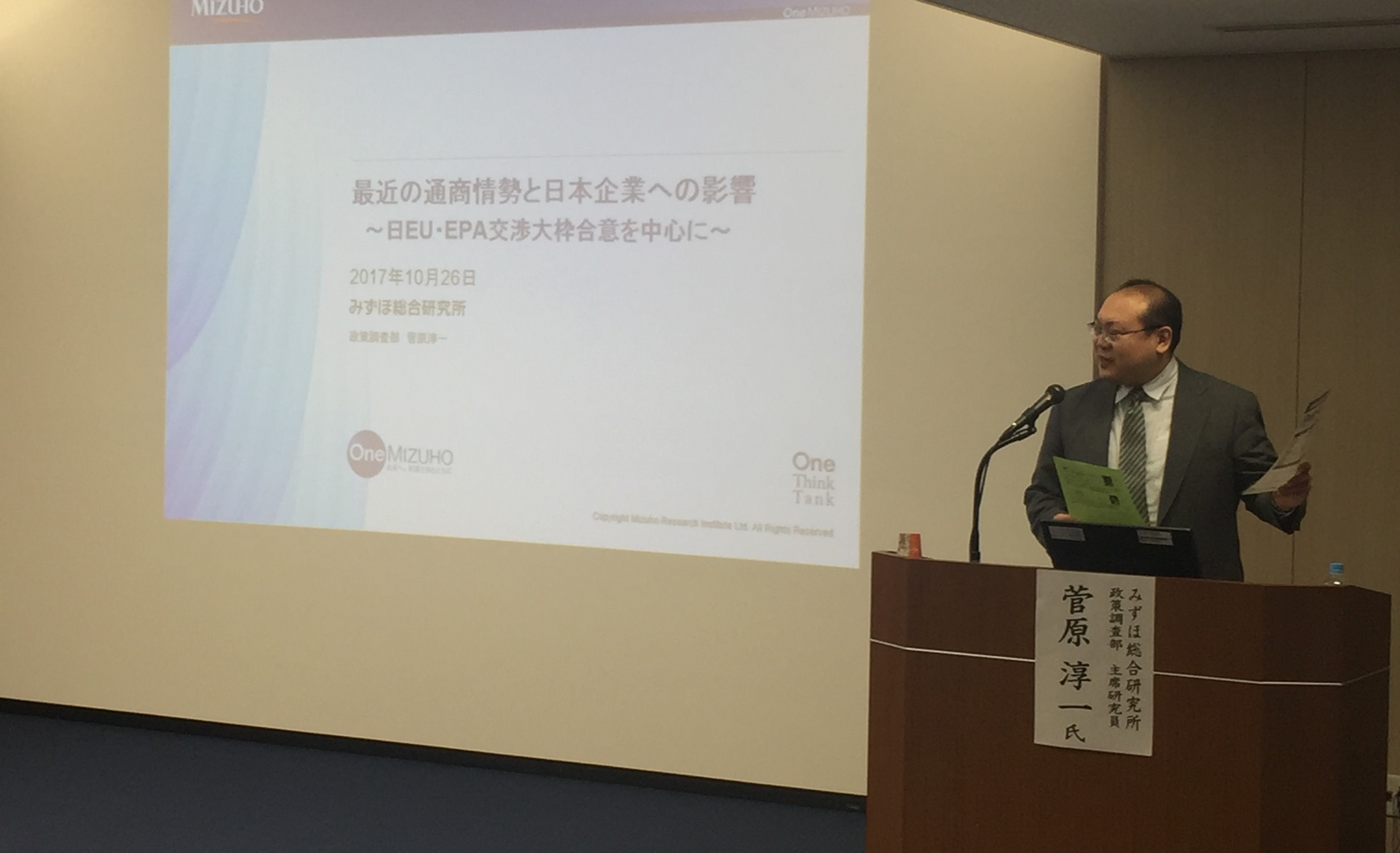 冒頭、中小企業国際展開推進委員会の柿﨑共同委員長より開会挨拶をしたのち、講師のみずほ総合研究所 政策調査部 主席研究員 菅原純一氏より、日欧EPAについて講演いただきました。講演では、前段日米経済対話についての概要を説明した後、日欧EPA交渉大枠合意の概要について、工業製品・農林水産物の観点から、関税撤廃率等具体的にお話いただき、また発効までの道のりや発効後の日欧協力の進展についてもお話いただきました。