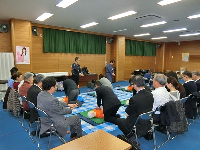 参加者は、人工呼吸と胸骨圧迫による心肺蘇生法のほか、AED(自動体外式除細動器)の使用方法、気道異物除去法、止血方法などについて、実技を交えながら学びました。