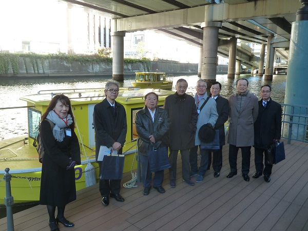観光委員会(委員長=佐々木隆副会頭・株式会社ジェイティービー相談役)は、11月21日に「第12回TOKYO DISCOVERY/江戸・東京の水辺探訪~日本橋川・神田川・隅田川 三大生活水路~」を開催し12名が参加しました。本事業は国内外の旅行者を想定し、著名な観光施設ばかりでなく地域に根差した観光資源を巡り、東京が持つ多彩な魅力を知ってもらうことを目的に平成22年から実施しています。今回は、2020年を見据え、水辺を活かした街のにぎわい創出や、観光・交通手段としての舟運の活用が官民を挙げ進められていることから、前回に引き続き「水上タクシー」を活用したプログラムとしました。