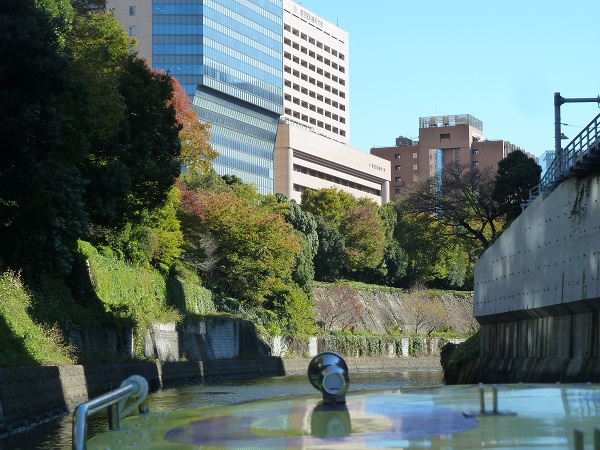 当日は、日本橋横の護岸にある船着場(日本橋船着場)から2隻の水上タクシー「TOKYO WATER TAXI」に乗船。普段では見ることのできない首都高速道路の真下を流れる日本橋川を遡りました。皇居の近くでは江戸城の城壁に今でも残る、石垣に刻まれた島津家などの家紋を見学しました。神田川に入ると都市における水上交通では世界的にも大変めずらしい、水道橋から御茶ノ水にかけての渓谷を通過しながら紅葉を楽しむことができました。JR、地下鉄が交差する聖橋を通過すると、川の両岸に数多くの船が繫留する江戸時代からの船宿群があり、現在でも観光船、釣船などで賑わいを見せていました。隅田川に入ると、夜はライトアップで水辺の賑わいを演出する清洲橋、永代橋を眺めながら亀島川を経由、下町情緒を楽しみながら日本橋に戻りました。
