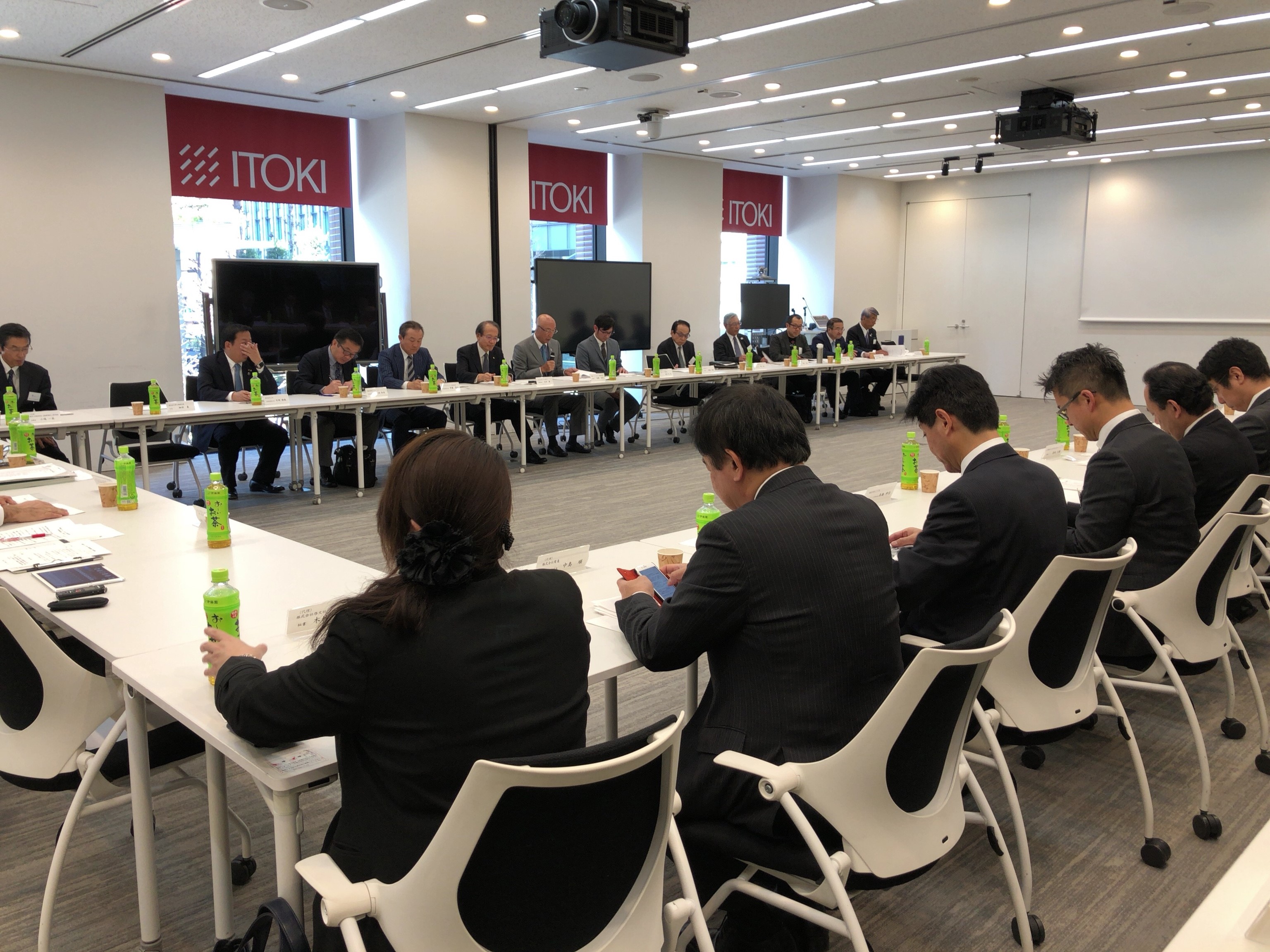 最後に「健康経営オフィス」をテーマにした株式会社イトーキ様のオフィスを視察しました。立って打ち合わせをするミーティングスペースや、歩幅が大きくなるように身長にあわせた歩幅がラインでひいてある廊下など、自然と身体活動を誘発するよう工夫がこらされたオフィス環境を見て、参加者はしきりに感心している様子でした。