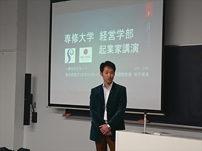 東京商工会議所 中小企業委員会(委員長=大久保秀夫・フォーバル会長)は1月9日、専修大学にて同学OBで三重県でカフェを運営する株式会社ブリオカフェカンパニー社長の吹戸成良氏を講師にお招きし、起業家セミナーを開催しました。本セミナーは、学生に創業をより身近に感じてもらい、アントレプレナーシップを醸成することを目的に、本大学経営学部の三宅秀道准教授にご協力いただき、開催しました。