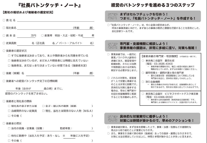 東京商工会議所墨田支部(会長:阿部貴明・丸源飲料工業㈱社長)は、1月16日、中小企業の経営者向けに、「事業承継」に関する早期の気づきを提供することを目的としたマンガ冊子「社長バトンタッチノート~想いを未来へつなぐ事業承継~」を発刊しました。
