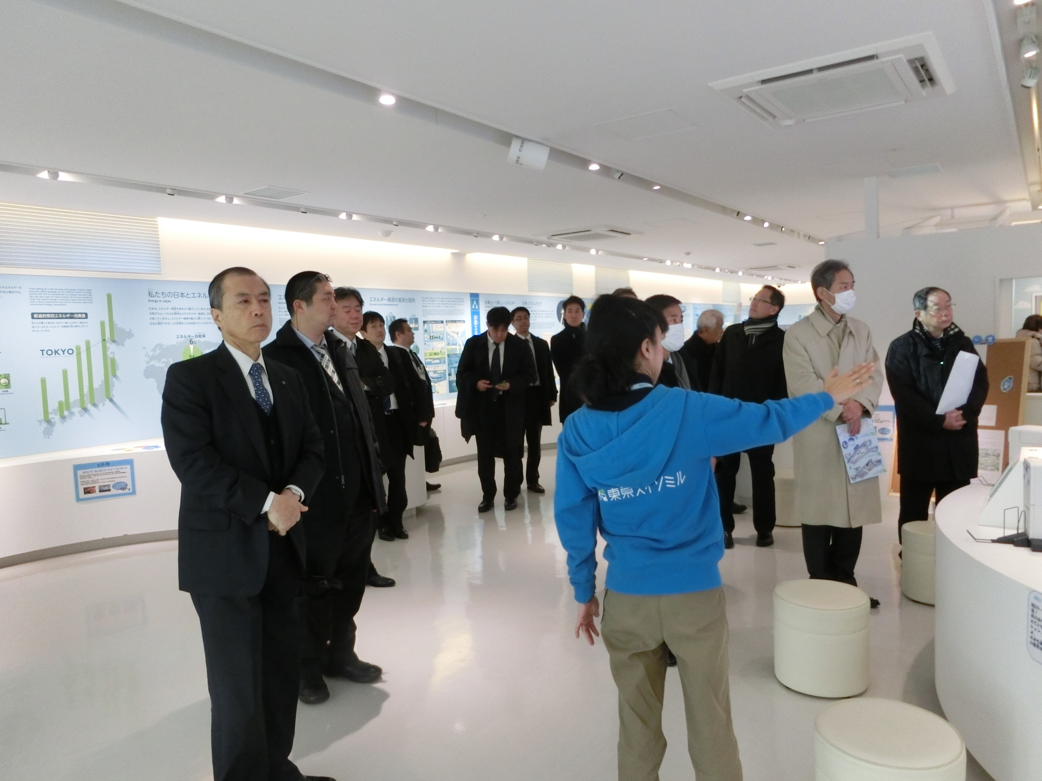 次に、東京都環境公社の水素情報館「スイソミル」を見学しました。スイソミルでは、水素エネルギーの特徴や水素社会の可能性について、展示を見ながら説明を受けた後、「水素社会の実現に向けた東京都の取組」と題してミニセミナーを開催し、東京都 地球環境エネルギー部 次世代エネルギー推進課長の堀様にご講演していただきました。水素エネルギーの活用を推進するために、水素を燃料として走る船舶の計画やCO2フリー水素の供給計画、水素ステーションの整備や燃料電池自動車・バスの普及計画、そして安定的な燃料供給と需要創出などの課題に今後東京都がどのように取り組んでいくのか、解説いただきました。