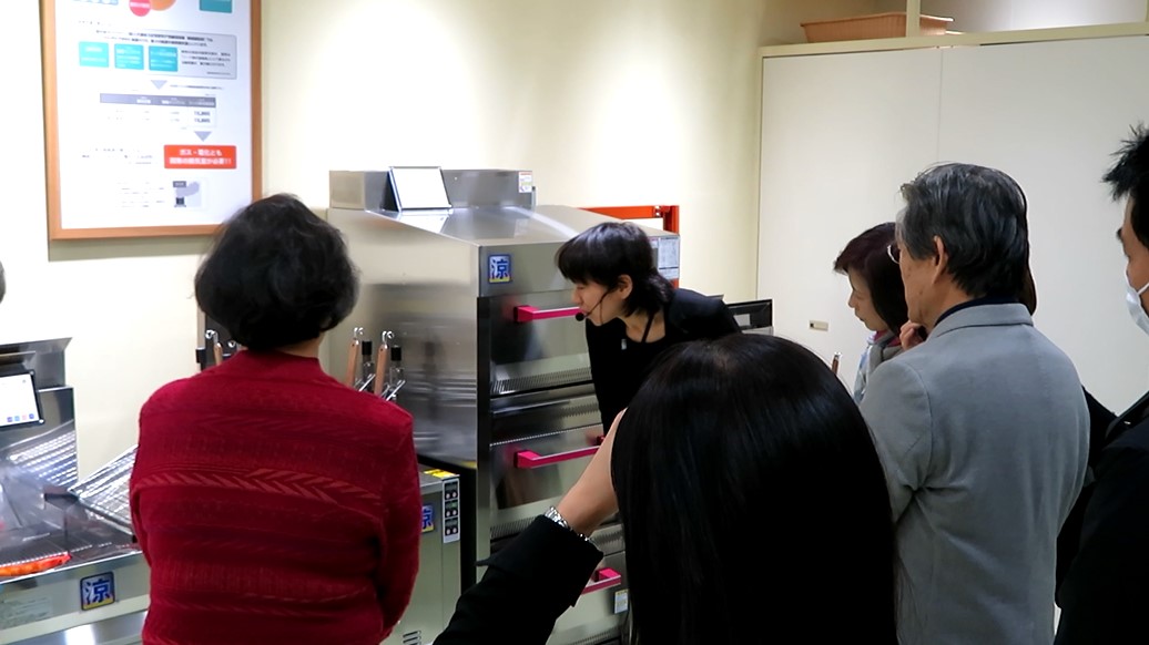 「厨BO!SHIODME」の見学会では、始めに実際に調理に使用している厨房設備に手を触れ、機器の進化を実感しました。次に、従来の設備を最新設備に更新することで、どのくらいの室温を下げられるのかを体感しました。ショールームでは、実際に厨房設備で火を起こして体験できます。参加者には、実際に飲食店を経営する方が多数おり、興味深く使い勝手を確かめていました。そして、これらの最新設備を使って実際に調理するとどうなるか、試食会で味わいました。