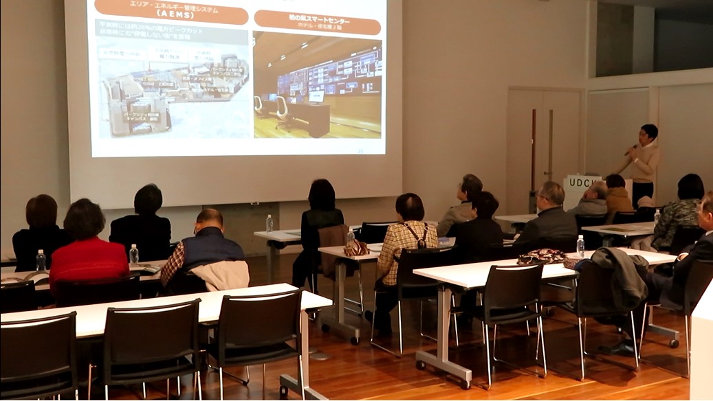 「柏の葉アーバンデザインセンター(UDCK)」の視察会では、最初に併設のレストラン「オークビレッジ柏の葉」で、地産地消の材料を用いたランチを堪能しました。オープンキッチンで、シェフが目の前で調理する「オークビレッジ柏の葉」のランチを堪能した参加者たちは、和やかに談笑のひと時を過ごしました。続けて、講堂に移動して「柏の葉アーバンデザインセンター(UDCK)」の成り立ちとこれまでの取り組み、そして今後の方向性について説明を受けました。参加者たちは、一様に真剣に説明に耳を傾け、活発な質疑応答が行われました。最後に、「柏の葉T-SITE」に立ち寄り、しばしショッピングの時間。最新設備、最新事例を視察する意義深いバスツアーを通じ、参加者は互いの親睦を深めることができました。