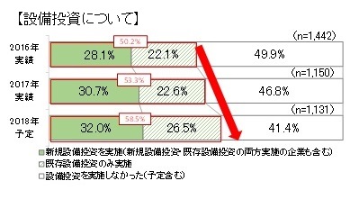 ・2017年は53.3%が設備投資を実施。2018年は58.5%の企業が設備投資の実施を予定しており、