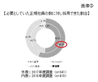 ○定期的または不定期に採用活動を行っている企業は68.2%であり、2017年度に正規社員の採用活動を行った企業のうち、「必要としていた正規社員の人数に対し採用できた割合」が「50%以下」と回答した企業は56.0%であった。前年度調査時と比較し、採用できた割合が「50%以下」と回答した企業は全体で5.2%増加した。