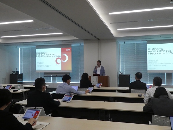 セミナーでは、講師より富士通における「ジョブ型人材マネジメント」「キャリアオーナーシップ」の取り組みについて、運用の実態や課題も含めて解説。講演後は、参加者から多数の質問が出されました。