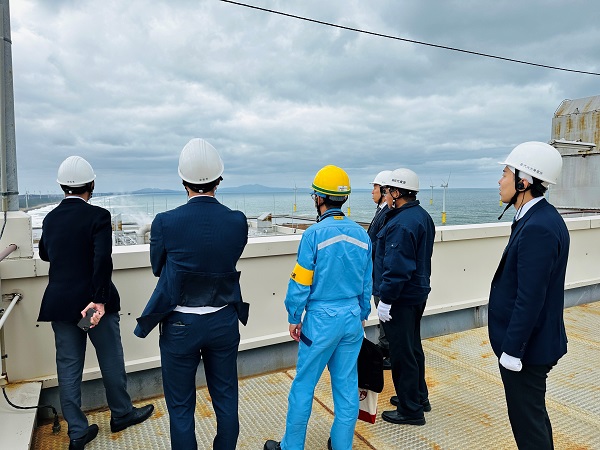 視察2日目(11/8)は、能代港に位置する東北電力㈱能代火力発電所「能代エナジアムパーク」を訪れ、奈良所長から同発電所の概要はじめエネルギーの安定供給や低炭素化に向けた取り組み等について解説をいただいた後、発電所施設内を見学しました。その後、はまなす展望台に移動し、今年1月より全面的な商業運転を開始した能代港洋上風力発電プロジェクトについて、秋田洋上風力発電㈱・岡垣社長から同プロジェクトの概要や今後の動向について解説いただくとともに、着床式洋上風力20基の風車を視察しました。