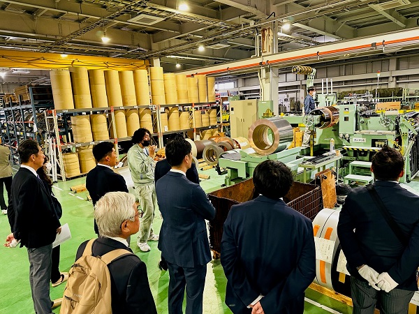 視察1日目(11/7)は、大仙市にある㈱タニタハウジングウエア(谷田泰社長)の秋田工場を訪問し、久保田工場長から、同社の歴史と継承された技術の中で、クラウドアプリによる製造工程の見える化(業務効率向上)の取り組みや、「金属」の多様性や今後の可能性等について説明いただきました。