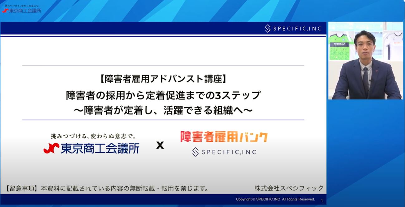 本セミナーは、障害者雇用の支援に携わる株式会社スペシフィック執行役員の鈴木貴大氏を講師に迎え、今後積極的に障害者雇用に取り組みたい企業等を対象として、障害者雇用の採用から定着までの留意点を3ステップに分けて解説するとともに、各ステップで活用できる公的支援策を紹介するなど、障害者の活躍促進を通じた労働時間の削減や生産性の向上につなげる目的で実施いたしました。