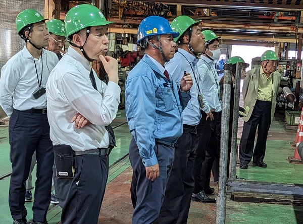 視察では、会社概要や技術・環境への取り組み・従業員教育等について説明を受けたのち、2班に分かれて工場全体を視察しました。石原社長・中野常務をはじめ工場幹部の皆さまが丁寧に設備や製造工程についてご説明くださり、その後の質疑応答を含めて時間いっぱい質問が飛び交う、中身の濃い視察会となりました。
