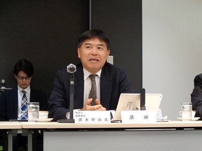まず、特許庁総務部長の清水幹治氏より「4者連携における特許庁の取組について」をご講演いただき、意見交換を行った。