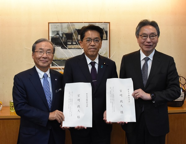 これに対し宮﨑厚労副大臣からは、「レポートの内容は商工会議所の知見が整理してまとめられており、政府としてもしっかり取り入れたい。賃上げについては、地方版政労使会議を都道府県で実施する予定としており、賃上げの機運醸成や環境整備に不足することについて議論いただきたい。また、多様な人材の活躍できる環境整備に向け、課題の本質に商工会議所が正面から向き合っていると感じる内容であった。多様な人材の活躍を通じて生産性を向上させる意識変革が重要であると思う。」などの発言があり、当所の要望内容についてご理解いただきました。