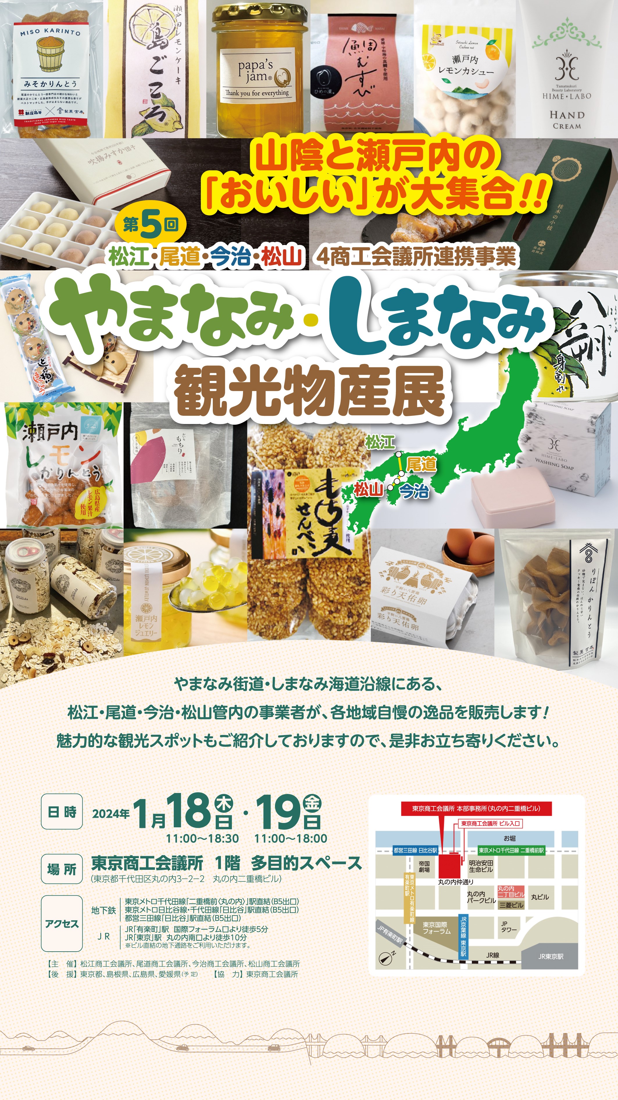 東京商工会議所本部ビル1階多目的スペースにて、1月18日(木)~1月19日(金)の2日間、松江・尾道・今治・松山4商工会議所主催によるイベント「第5回やまなみ・しまなみ観光物産展」が開催されます。