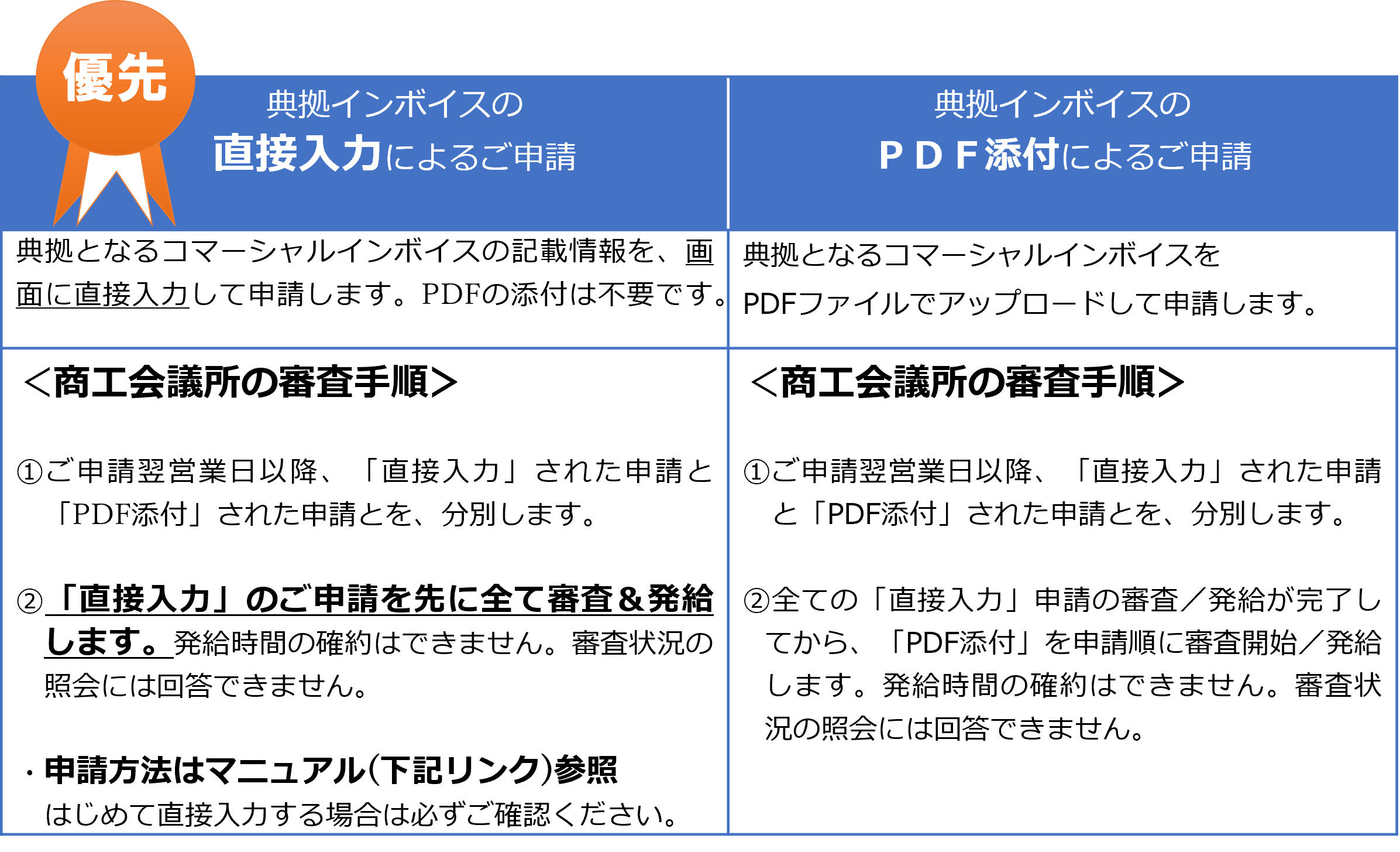 オンラインによる貿易関係証明発給システムを導入して1年が経過し、現在では多くの皆様にオンラインでのご申請をいただいております。一方で、申請件数の増加に伴い、これまでより審査処理に時間がかかり、発給までお待たせする時間が増えてまいりました。