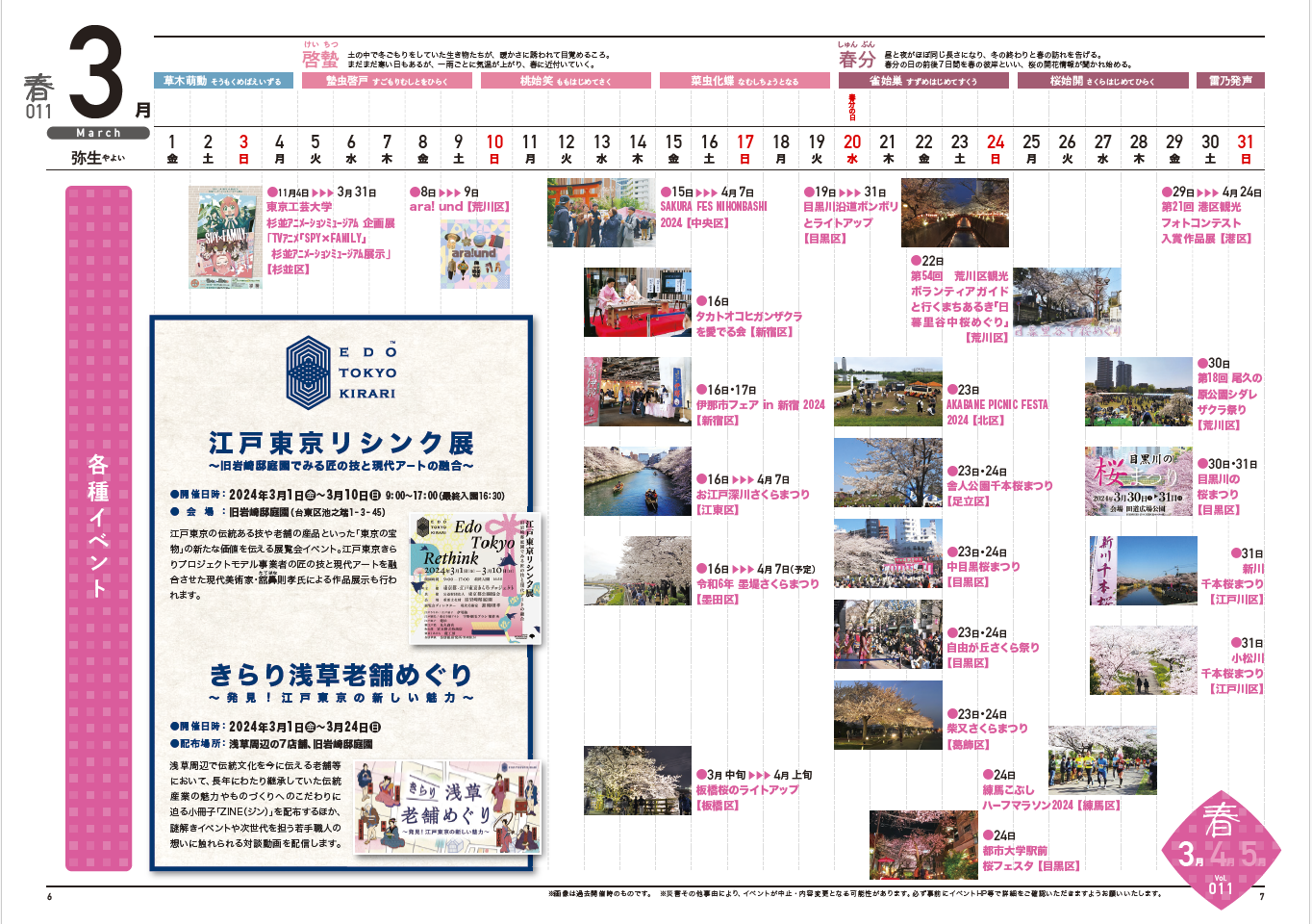 今号では「東京の春」をテーマに、東京23区の観光協会・区役所等協力のもと、3月~5月のイベント情報を中心に、東京23区内で春を感じられる地域密着情報をお届けしています。