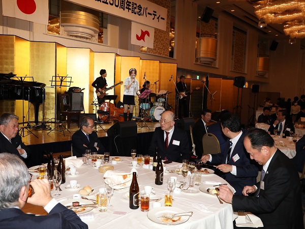 記念パーティーは、ウエルカムミュージックの流れる中、和やかなムードで始まりました。近藤会長の挨拶、来賓紹介の後、上條副会頭から乾杯の発声があり、歓談の時間には各テーブルで積極的な名刺交換・情報交換が行われました。その後、足立区のライブバーで活躍する「マリリン&キラーズ」によるオールディーズの演奏が行われ、会場が一体となって盛り上がりました。