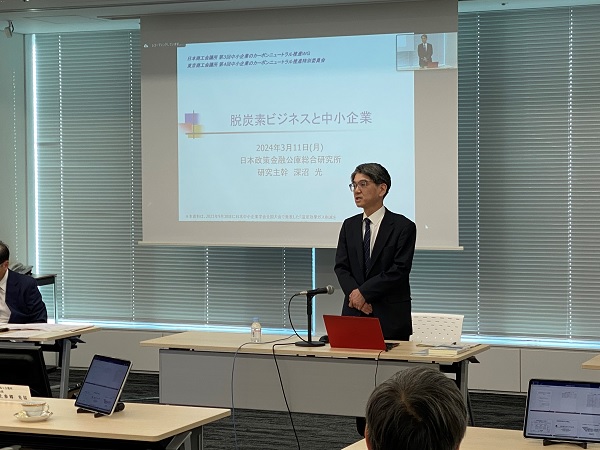 まず、日本政策金融公庫総合研究所 研究主幹 深沼 光 氏から、「脱炭素ビジネスと中小企業」と題してご講演いただき意見交換を行った。深沼氏からは、中小企業の脱炭素への取り組みに関する調査の紹介や脱炭素ビジネスの事例も踏まえた現状や成功のポイント等についてご説明いただいた。