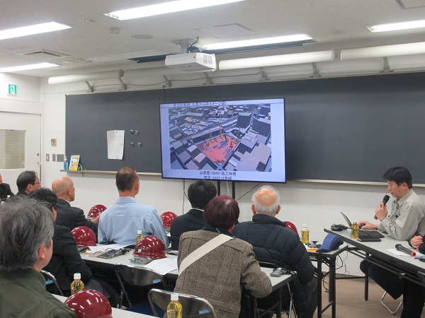 当支部副会長で自由が丘一丁目29番地区市街地再開発組合理事長の岡田不動産(株)岡田一弥代表取締役社長のご協力により、この度の視察会開催に至りました。再開発事業の概要および施工計画の説明を聞いた後、通常見ることが出来ない建築工事中の現場を視察させていただきました。